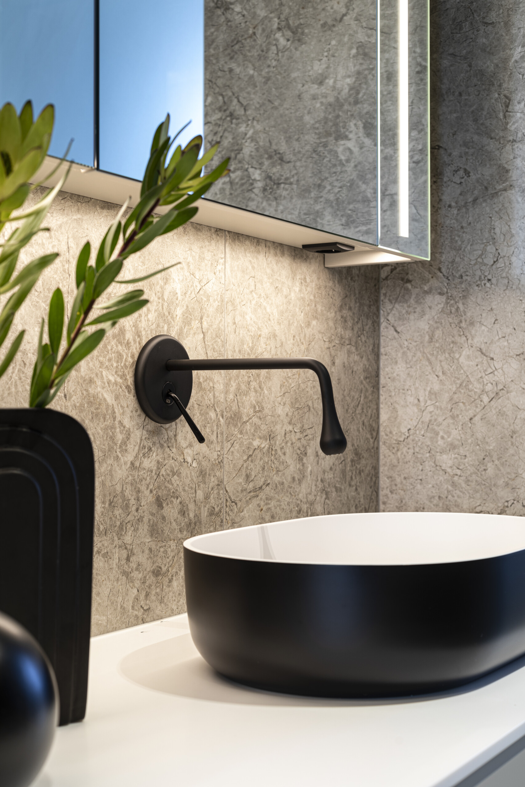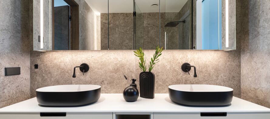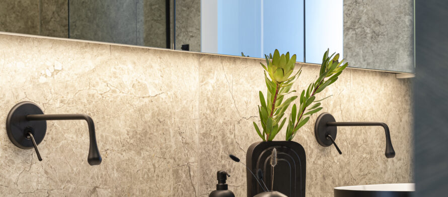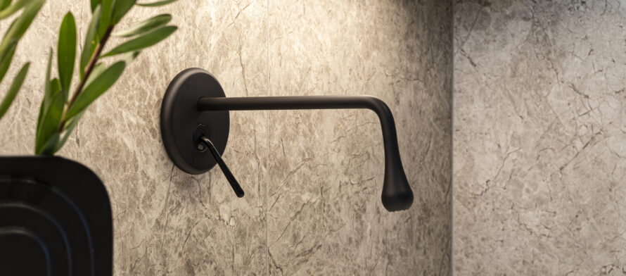 In the bathroom adjoining the boys’ bedrooms, the bold contrast of Neo-series countertop basins in black and gold takes centre stage. Their clean lines and strong character bring personality to the space. The interior’s black accents highlight the modern aesthetic, creating an ambiance that is both solid and elevated.