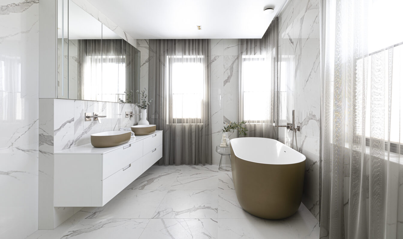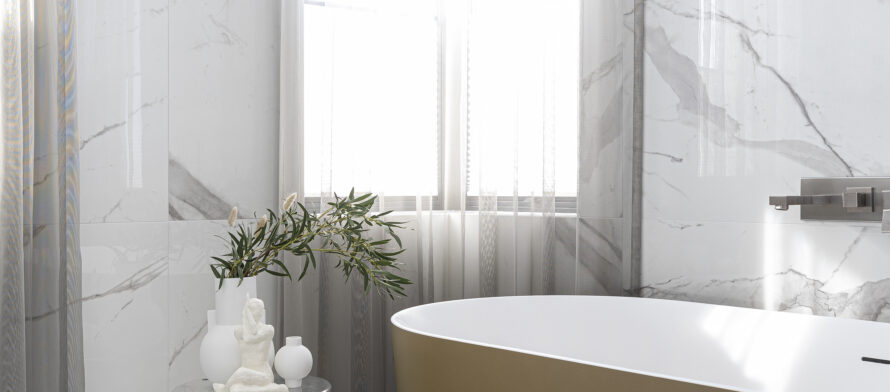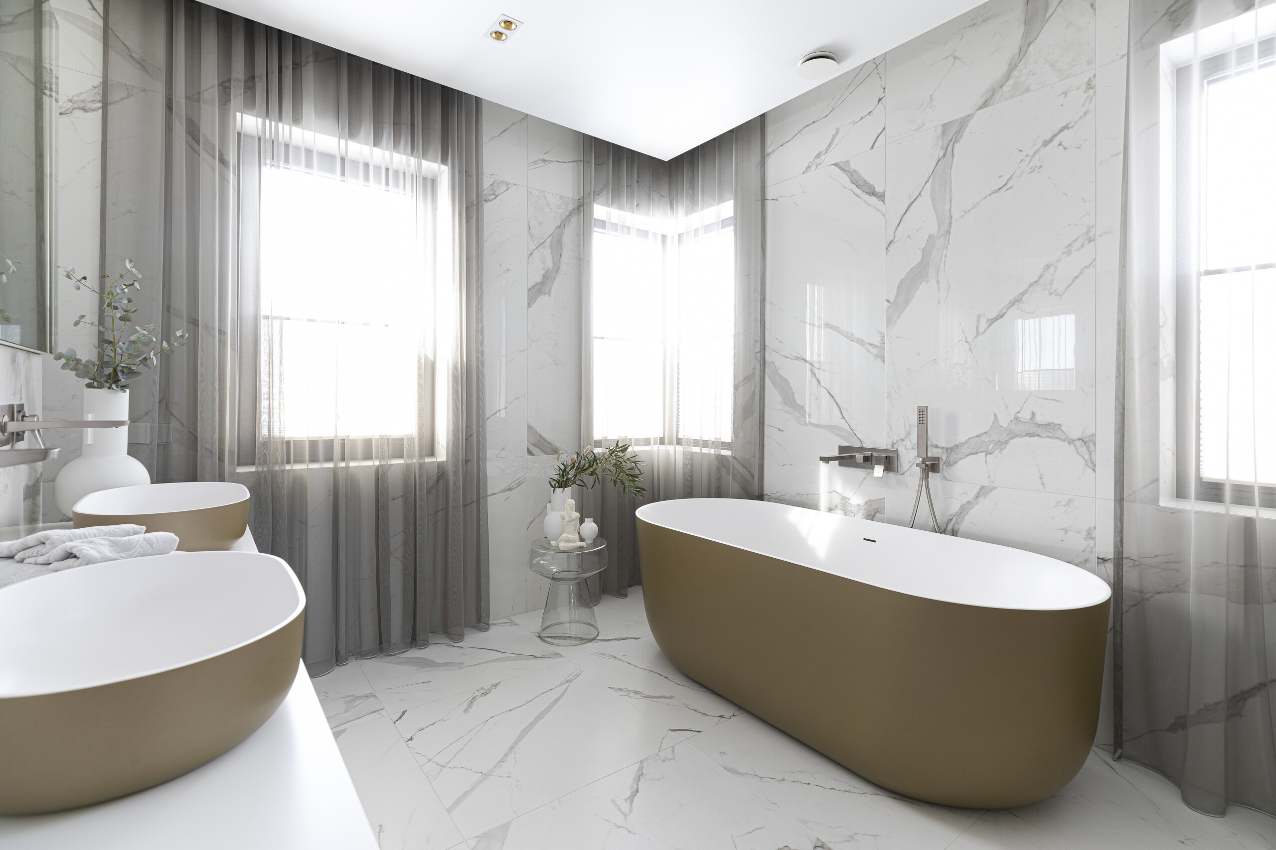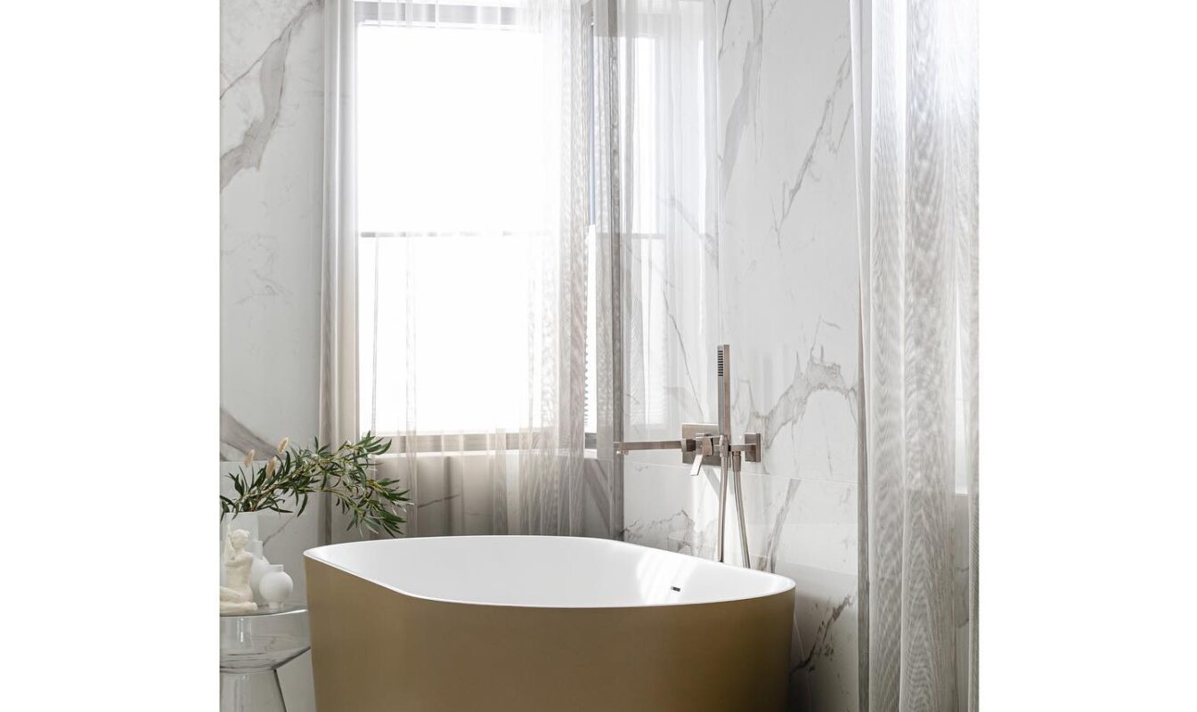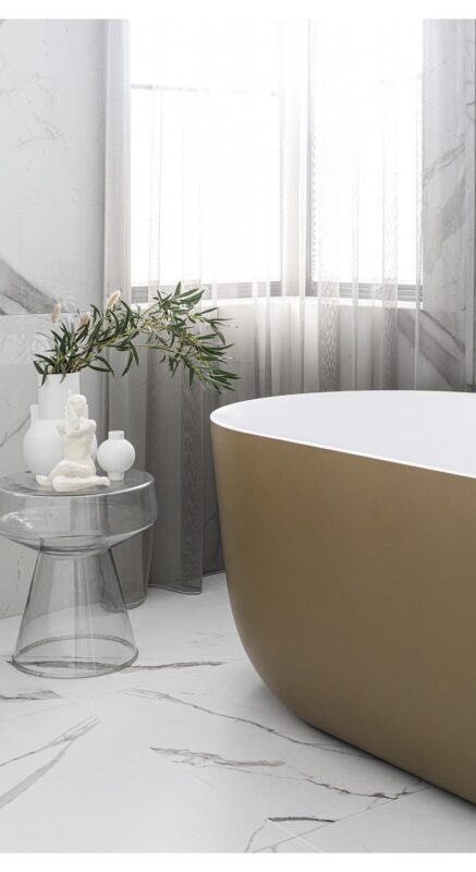 The bathrooms of this private residence in Peetri reflect both elegance and functionality, with every detail carefully selected to ensure visual appeal and everyday comfort. The en-suite bathroom, connected to the master bedroom, is a true sanctuary of calm – centered around the Balteco Marin Xonyx stone bathtub with a golden exterior finish that creates a warm and luxurious atmosphere. Positioned in the middle of the room, the bathtub becomes a striking focal point, inviting relaxation.
