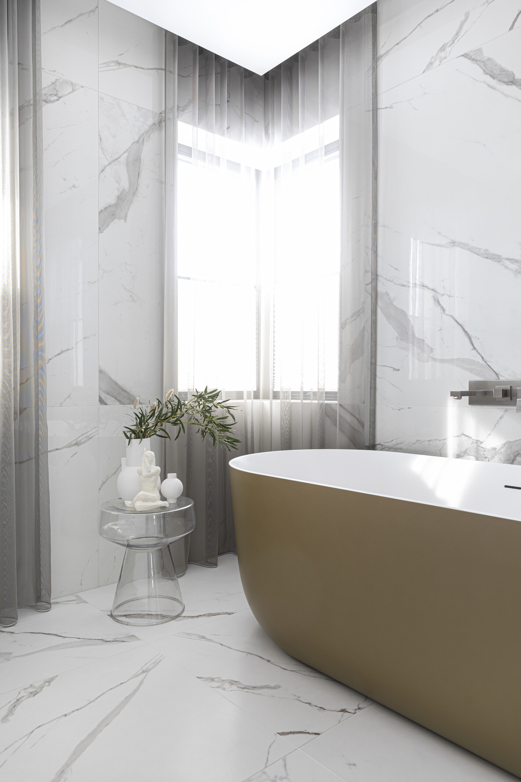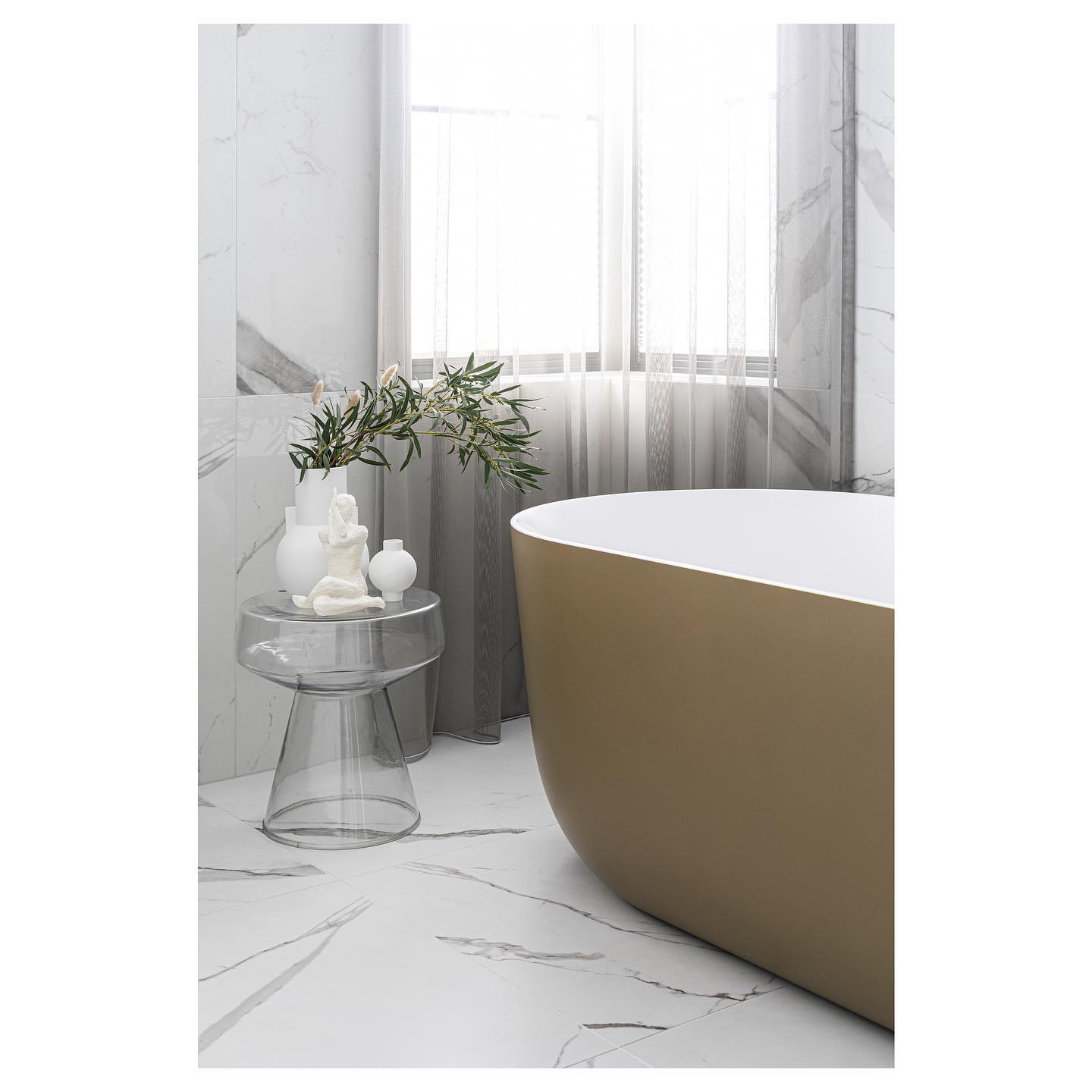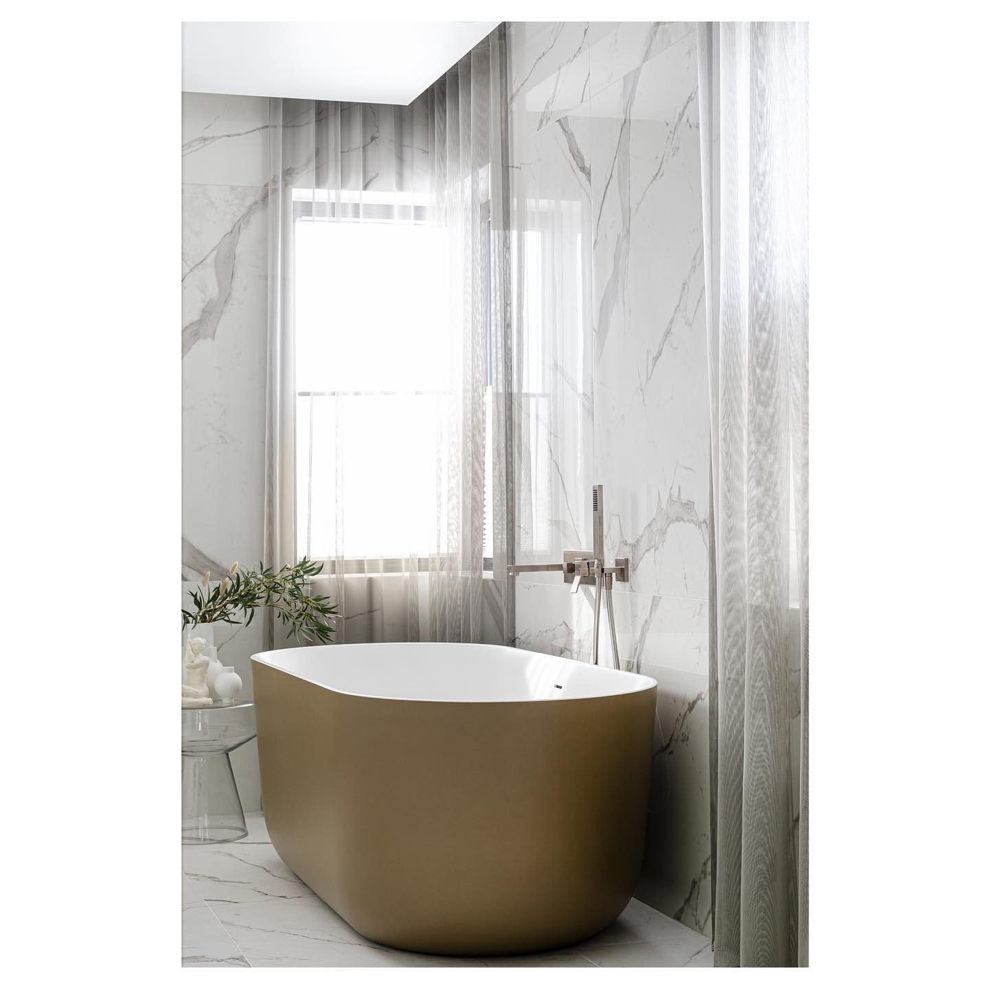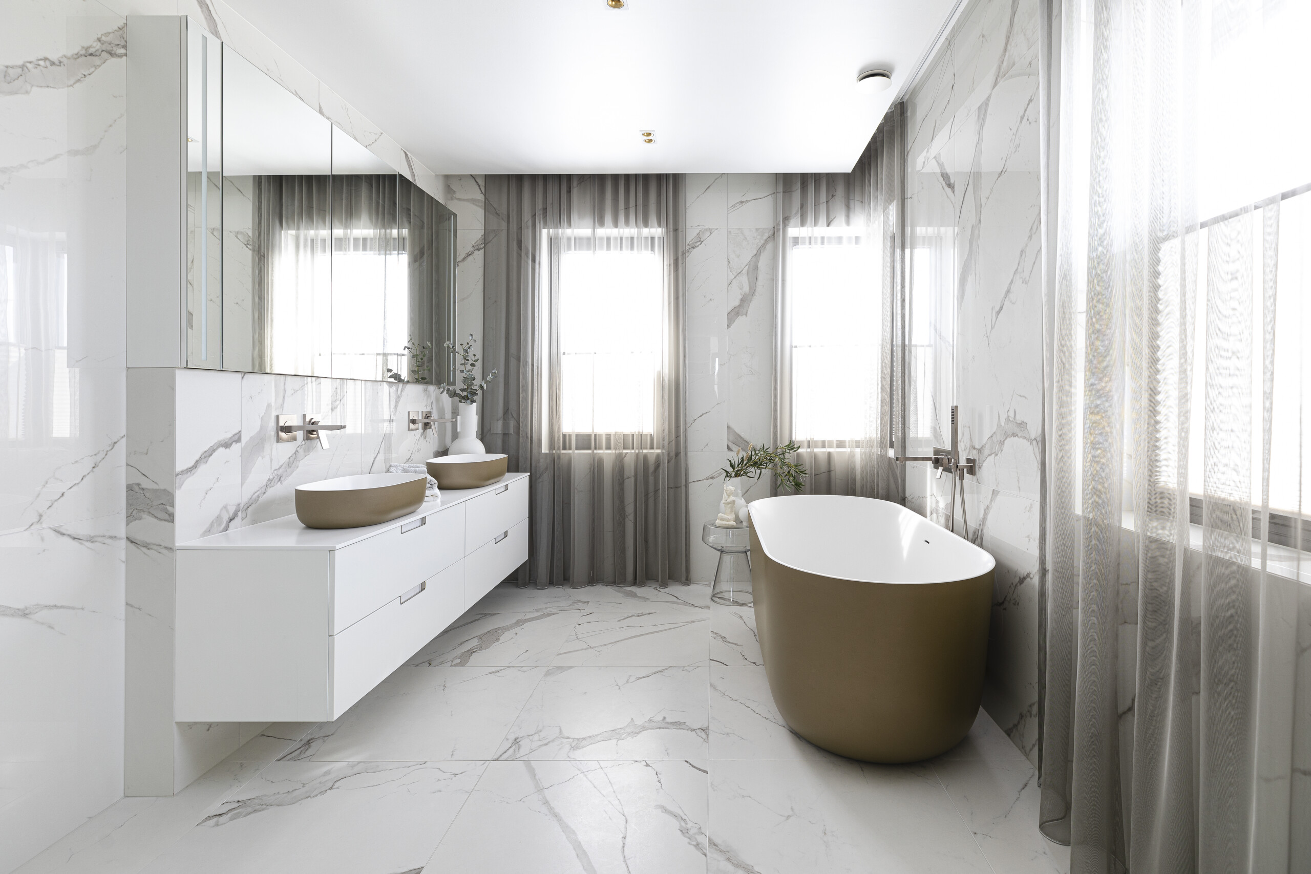 The bathrooms of this private residence in Peetri reflect both elegance and functionality, with every detail carefully selected to ensure visual appeal and everyday comfort. The en-suite bathroom, connected to the master bedroom, is a true sanctuary of calm – centered around the Balteco Marin Xonyx stone bathtub with a golden exterior finish that creates a warm and luxurious atmosphere. Positioned in the middle of the room, the bathtub becomes a striking focal point, inviting relaxation.