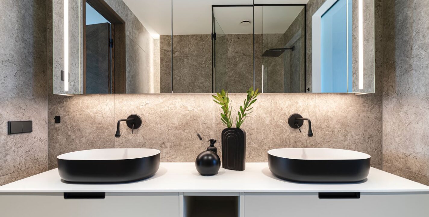 The bathroom of this modern home was designed by interior architects Diana and Kate Kadi (Element OÜ), with a consistent focus on minimalist elegance and thoughtful functionality. At the heart of the space are the Balteco Neo series Xonyx solid surface basins.