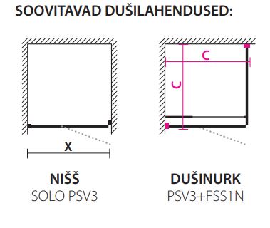 Form Plus dušo kabina susideda iš durų su šonine sienele (PSV3R/PSV3L) ir atskiros fiksuotos sienelės (FSS1N), kurios kartu sukuria erdvią ir funkcionalią dušo zoną. Fiksuota sienelė tvirtinama prie grindų U profiliu, o stabilumą užtikrina sieninis profilis ir iki 100 cm ilgio atraminė juosta. Dušo kabinos aukštis – 200 cm, naudojamas 6 mm grūdintas saugus stiklas (skaidrus arba pilkas). Aliuminio profiliai prieinami anoduoti arba juodos apdailos. Dušo durys yra kairinės arba dešininės.