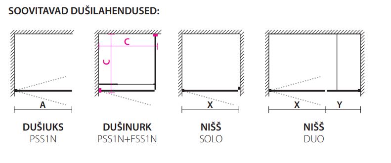 - Dušo durys PSS1N – 200 cm aukščio, 6 mm grūdintas stiklas (skaidrus arba pilkas), anoduoto, balto arba juodo paviršiaus aliuminio profiliai. Komplekte yra rankena, magnetinės ir vandens sandarinimo juostos bei tvirtinimo detalės.