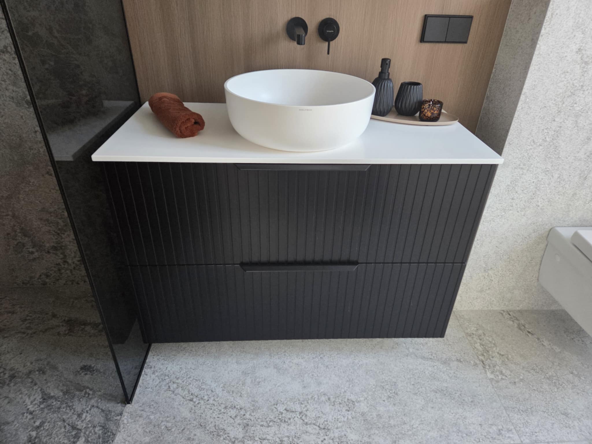 Interjero koncepciją papildo Balteco Forma Stripe vonios kambario baldai su išraiškingais briaunuotais fasadais ir dviem talpiais stalčiais, derinantys vizualinį charakterį ir kasdienį praktiškumą. Kompoziciją užbaigia Xonyx™ stalviršiai, kurie kartu su praustuvėmis sukuria vientisą ir aukštos kokybės sprendimą.