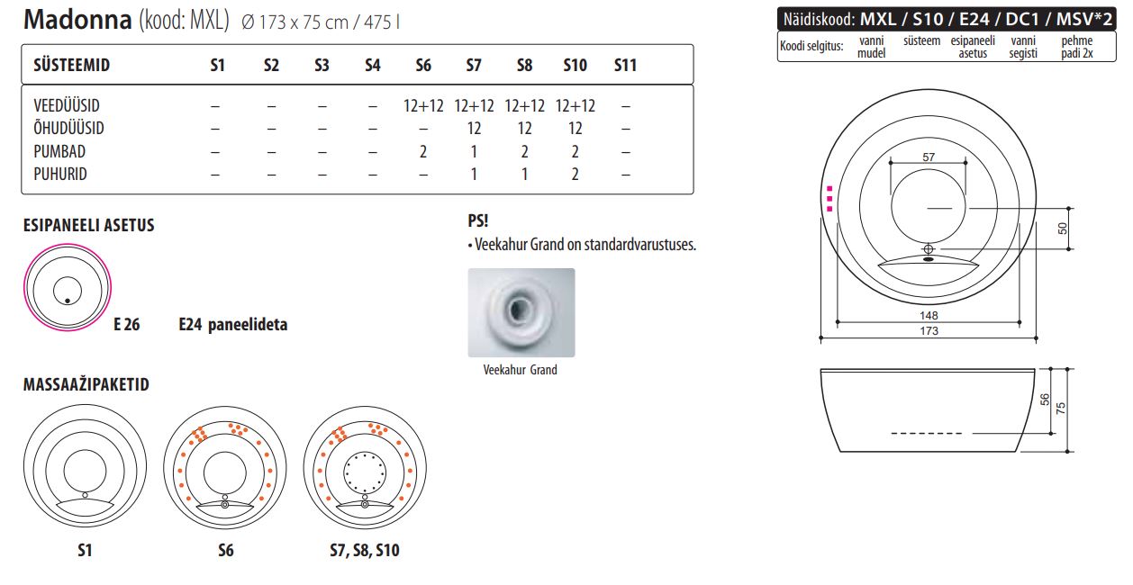 Eestis disainitud ja toodetud Balteco vannid on valmistatud Prantsuse Altuglas kõrgekvaliteedilisest akrüülist ning tugevdatud innovaatilise Polycore™ tehnoloogiaga. Tugev alumiiniumraam, kruvivabad magnetkinnitustega paneelid ning optimaalne sügavus loovad vastupidava ja mugava vanni. Vaiksed massaažipuhurid, töökindlad veepumbad ja ohutust tagavad veetaseme andurid tagavad lõõgastava ja turvalise vannielamuse. Kõik vannid läbivad põhjaliku testimise ja vastavad Euroopa kvaliteedistandarditele. Allpool leiad teavet selle vanni massaažisüsteemi kohta.