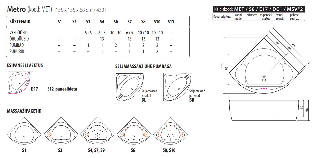 Metro on luksulik kauni vormiga nurgavann, mis loob vannituppa luksusliku atmosfääri. Vanni sügav ja sümmeetriline kuju tagab maksimaalse lõõgastuse, samas kui kvaliteetne akrüülmaterjal ning tugev konstruktsioon tagavad vastupidavuse aastateks. Ideaalne valik, kui soovid oma vannituppa midagi eristuvat ja nauditavat. Valikus ilma esipaneelita versioon või Panel+ akrüülpaneel magnetkinnitustega.