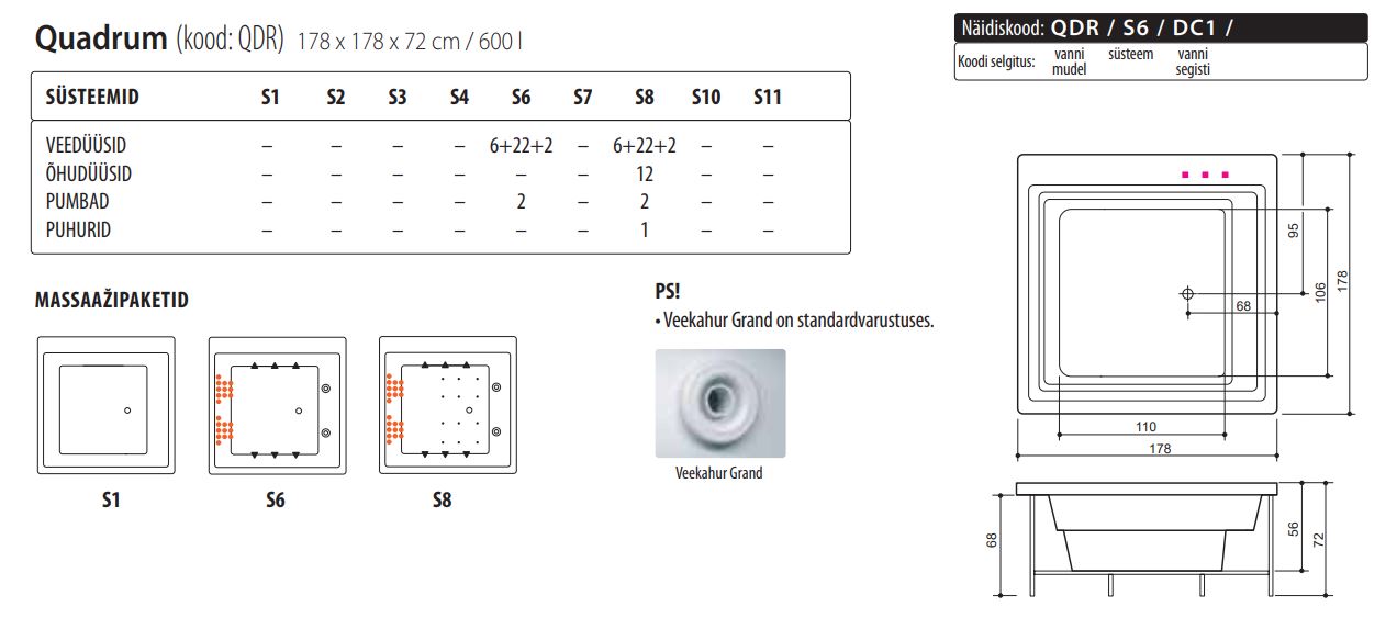 Eestis disainitud ja toodetud Balteco vannid on valmistatud Prantsuse Altuglas kõrgekvaliteedilisest akrüülist ning tugevdatud innovaatilise Polycore™ tehnoloogiaga. Tugev alumiiniumraam, kruvivabad magnetkinnitustega paneelid ning optimaalne sügavus loovad vastupidava ja mugava vanni. Vaiksed massaažipuhurid, töökindlad veepumbad ja ohutust tagavad veetaseme andurid tagavad lõõgastava ja turvalise vannielamuse. Kõik vannid läbivad põhjaliku testimise ja vastavad Euroopa kvaliteedistandarditele. Allpool leiad teavet selle vanni massaažisüsteemi kohta.