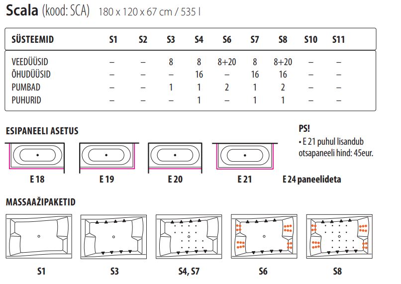Eestis disainitud ja toodetud Balteco vannid on valmistatud Prantsuse Altuglas kõrgekvaliteedilisest akrüülist ning tugevdatud innovaatilise Polycore™ tehnoloogiaga. Tugev alumiiniumraam, kruvivabad magnetkinnitustega paneelid ning optimaalne sügavus loovad vastupidava ja mugava vanni. Vaiksed massaažipuhurid, töökindlad veepumbad ja ohutust tagavad veetaseme andurid tagavad lõõgastava ja turvalise vannielamuse. Kõik vannid läbivad põhjaliku testimise ja vastavad Euroopa kvaliteedistandarditele. Allpool leiad teavet selle vanni massaažisüsteemi kohta.